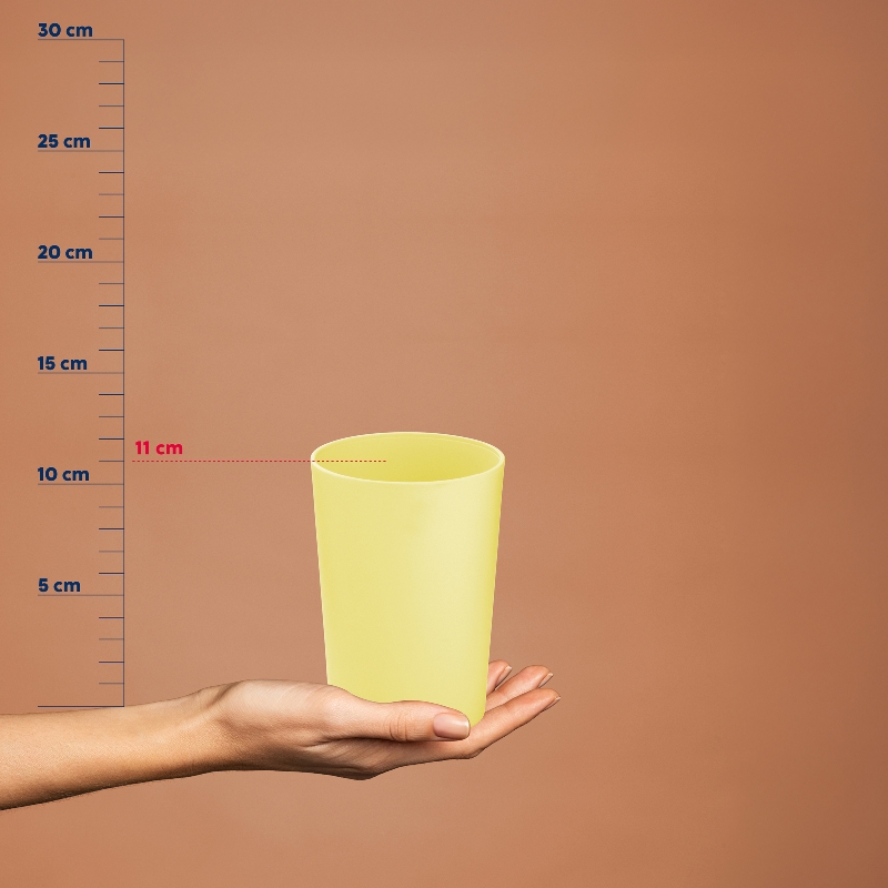 Becher Marta aus Kunststoff in der Farbe Sonnengelb. Höhe 11 cm, Ø 8,0 cm.