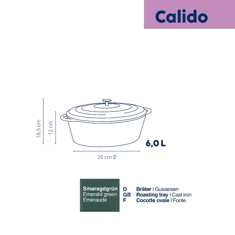 Gusseisenbräter Calido Oval, 33 x 26 x 12 cm, fasst 6,0 L, außen Glänzend, in Smaragdgrün/Beige mit Deckel. Bis 300° C verwendbar. Gesamtlänge inklusive Griffe: 42 cm. Bodenfläche innen 27,5 x 19,5 cm, außen 30 x 22 cm.