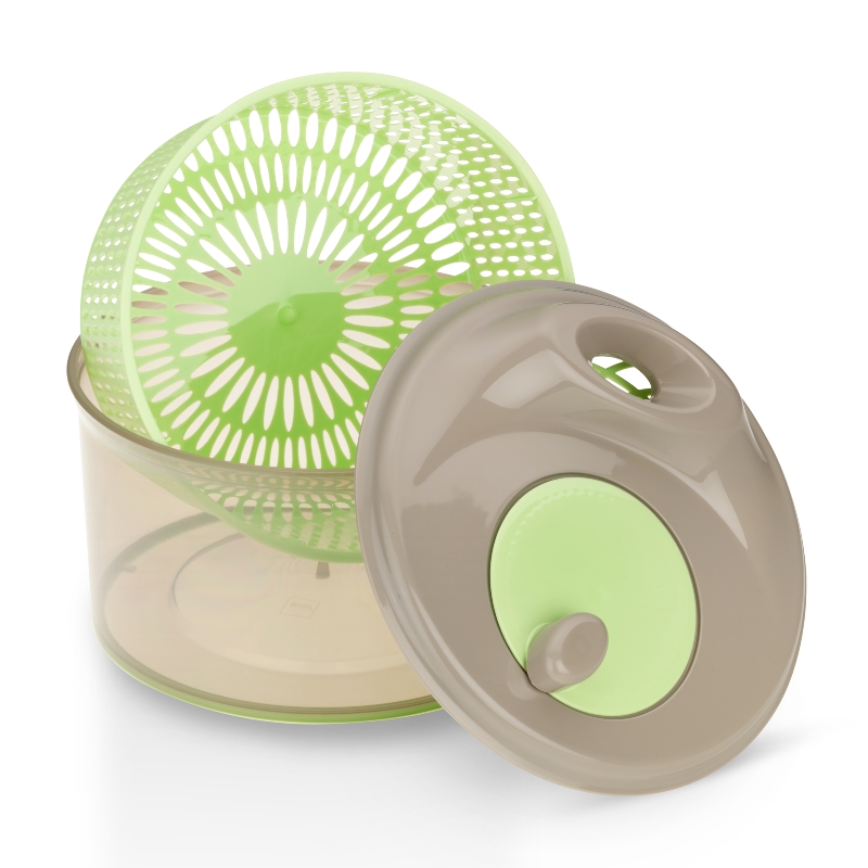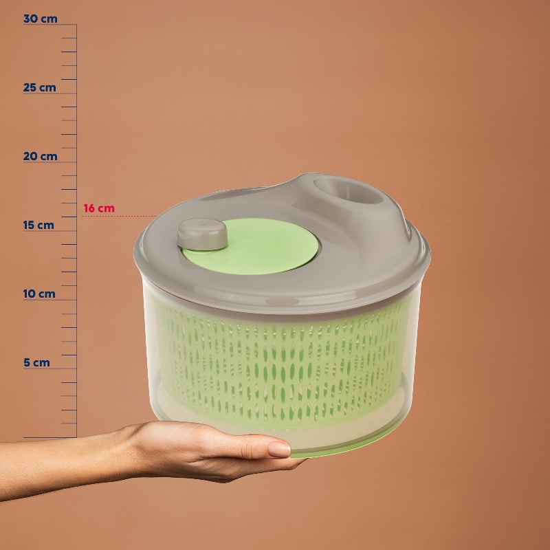 Salatschleuder aus PP-Kunststoff in pastellgrün mit folgenden Maßen: 16,0 cm Höhe, 23,0 cm Durchmesser und 4,3 Liter Inhalt.