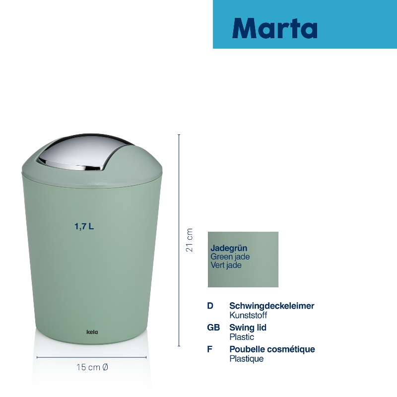 Passend für jede Art von Tisch oder für andere Einsatzzwecke. Der kleine Tischeimer Marta mit formschönem Schwingdeckel. Der Eimer besteht aus Kunststoff und besitzt ein Volumen von 1,7 l. Der einfach gerundete Schwingdeckel in der Farbe silber rundet das Aussehen elegant ab. Ein echter Blickfang! Genial ist dabei auch die große Farbauswahl, da sollte für jeden Geschmack und Stil das Passende dabei sein!